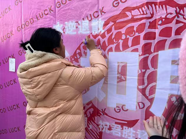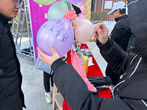 考研学生们扎消极词汇气球、系内学生写祝福话语、贴金榜题名留言贴、钉师生祝福明信片,营造校图书馆温馨、励志的环境氛围,给予考研学子支持、鼓励,帮助疏解考研学子学习压力,陪伴和助力考研学子更好度过考研时光。