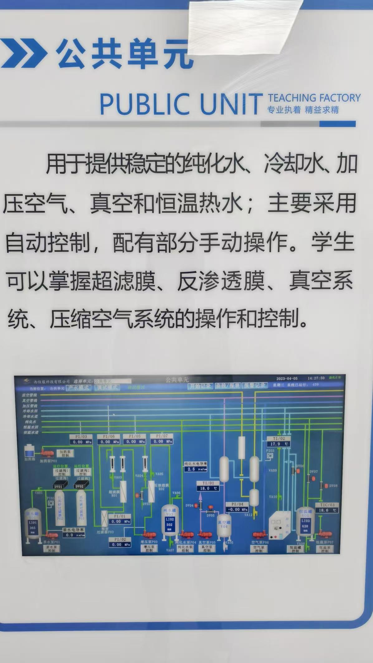 用于提供稳定的纯化水、冷却水、加压空气、真空和恒温热水;主要采用自动控制,配有部分手动操作。学生可以掌握超滤膜、反渗透膜、真空系统、压缩空气系统的操作和控制。