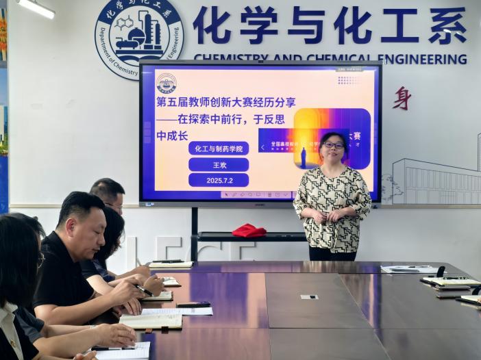 在2025年7月2日化学与制药工程学院王欢教授作为获奖教师代表,就教学创新大赛的经验进行分享交流,王欢教授围绕参赛初衷、校赛历程、收获感悟与未来规划展开分享,为在场教师带来一场深度教学创新经验交流。