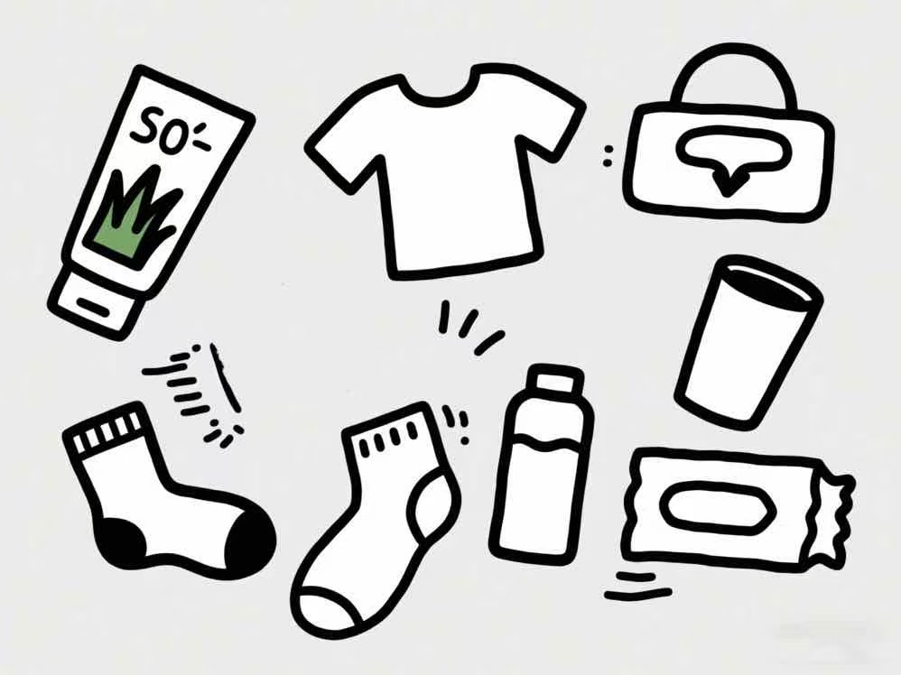 吸汗透气的袜子:多准备几双棉质运动袜,吸汗性强,能保持脚部干爽,防止磨脚和脚臭。
