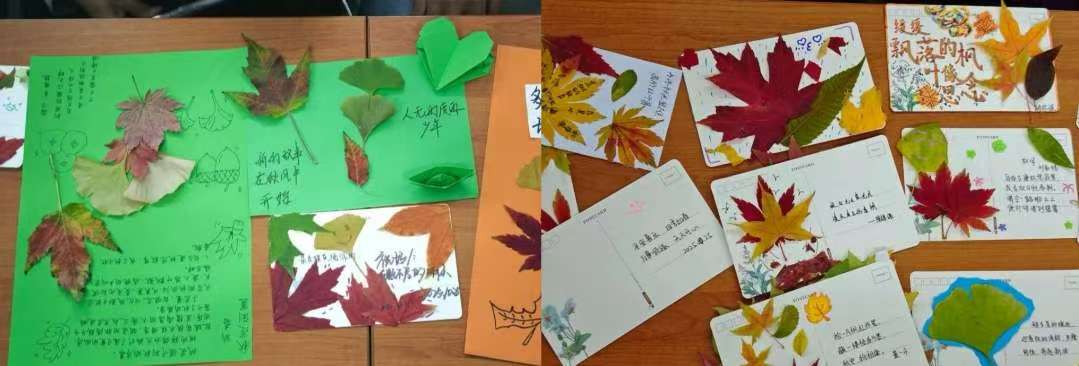 这些凝聚心意的作品在灯光下熠熠生辉。他们将书法艺术与落叶元素相结合,打造出兼具美观与情感的书法明信片;有的以渐变色调呈现层林尽染,有的用粘贴的方式留住草木本真。每一张明信片都承载着不同的秋日故事——或是思念,或是祝福,亦或是对季节更迭的细腻感知。