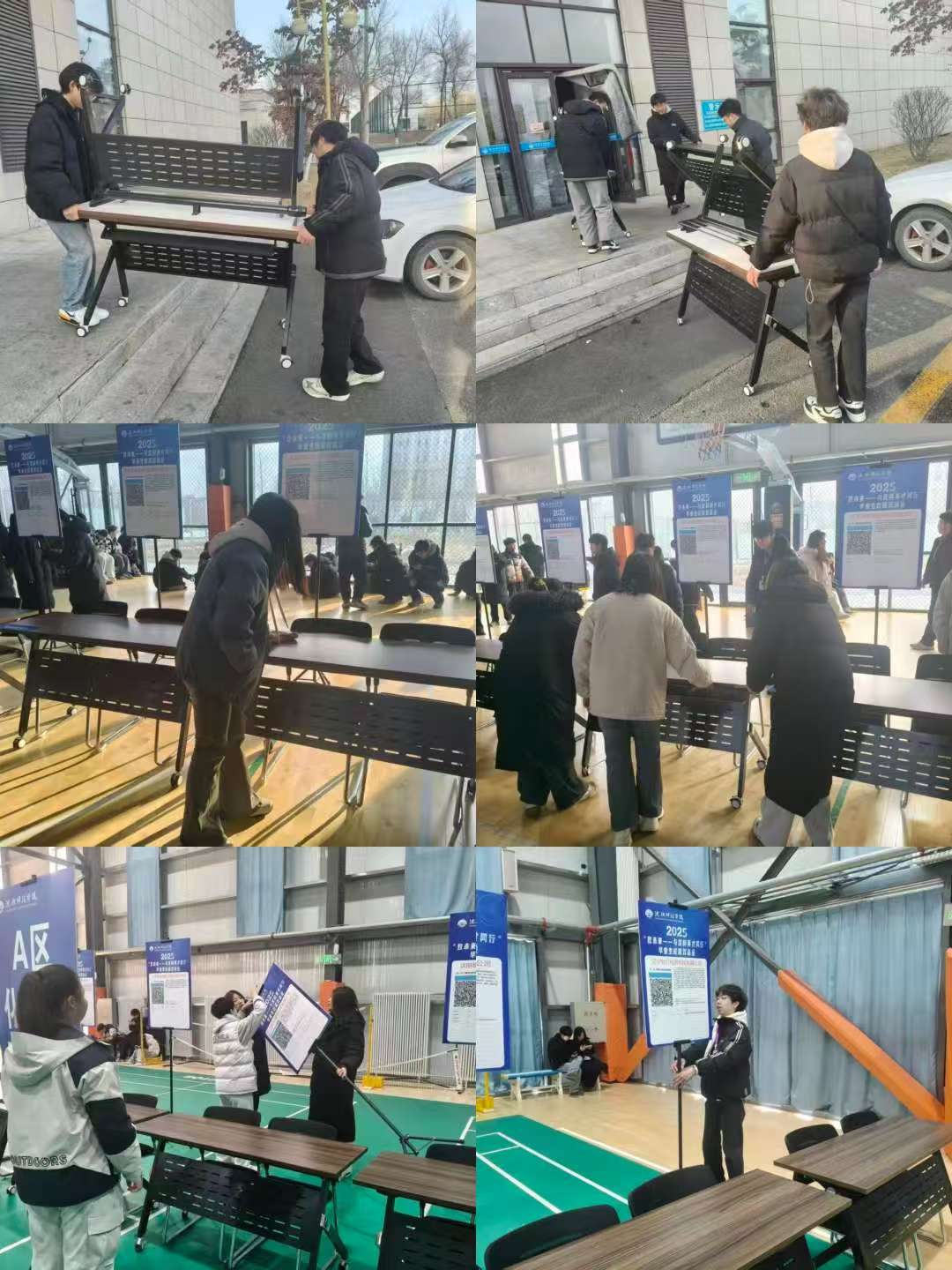 双选会前日,风华体育馆内已是一片繁忙。太阳集团网tyc9728的学生志愿者们早早投入会场布置工作。搬运物资、整齐摆放桌椅、悬挂指引标识、划分功能区……他们一丝不苟,确保每一个展位清晰明了,每一条通道安全畅通。