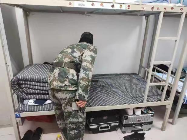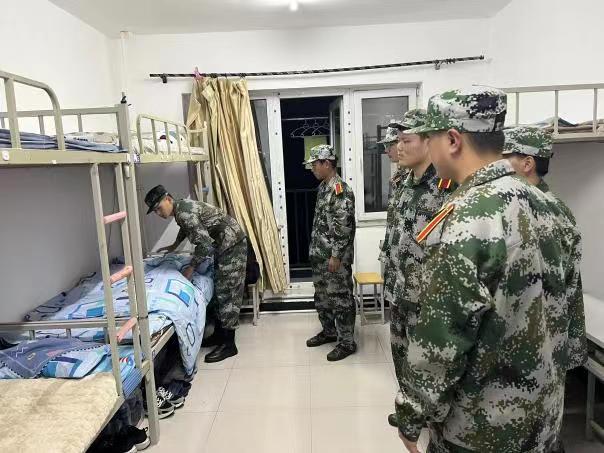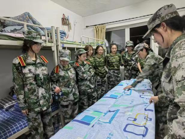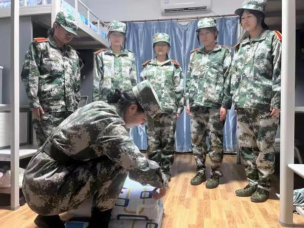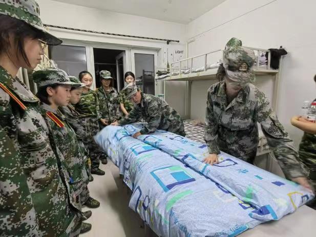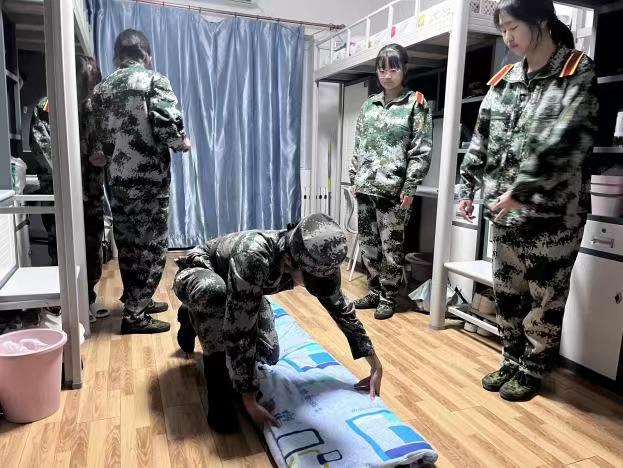 教官们亲自上阵,示范折被子的详细步骤,并明确各类物品的摆放位置。同学们认真学习要点,在示范结束后立刻进行练习。方方正正的被子、整齐摆放的物品便是同学们纪律严明、一丝不苟的见证。