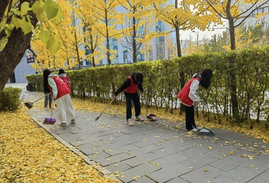 在打扫过程中,秋风与清扫声交相呼应,高效的配合和分工使得整个清扫过程井然有序,短时间内就将堆积如山的树叶清理干净。同学们用自己的实际行动为校园的优美环境贡献了自己的力量,表达着对校园的热爱,展现出化工学子的良好风貌。