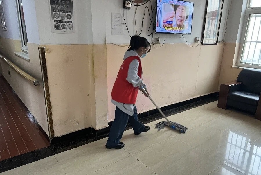 志愿者们为老人整理床铺,扫地拖地。通过这个活动不仅拉进了我们与老人之间的距离,更表达了我们对他们生活质量的关心,一个整洁的环境不仅能带给老人愉悦的心情,也能帮助老人预防一些疾病。