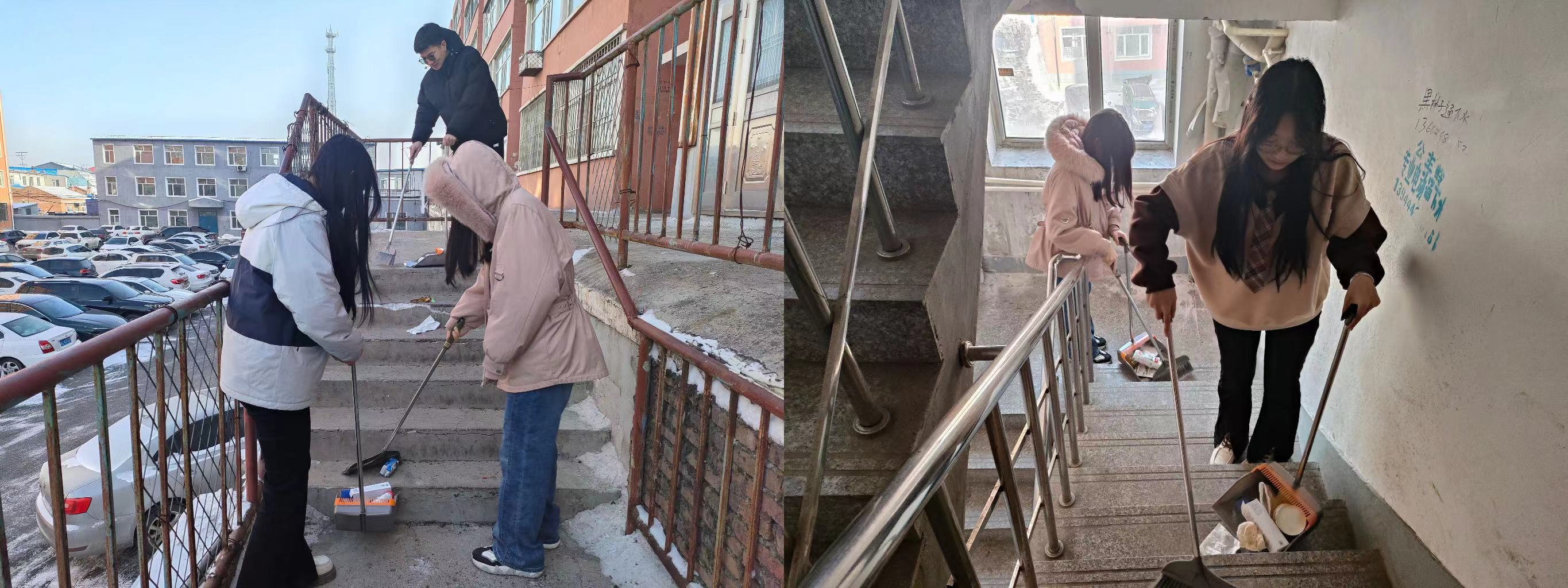 化学与化工系“青春服务,志愿同行”社会实践团队应化2201苑美岐、制药2302张正树、化工2301董力嘉在吉林省长春市黑林子街道担任志愿者,主要负责打扫居民社区的楼道卫生。他们跟随工作人员深入基层,真正做到了走出校园,走出课堂,走向社会,到社会的大课堂中,增长才干,磨练意识,在实践中检验自己。此次返家乡社会实践活动,不仅仅是一次回馈家乡的机会,也是一次自我挑战和成长的过程。