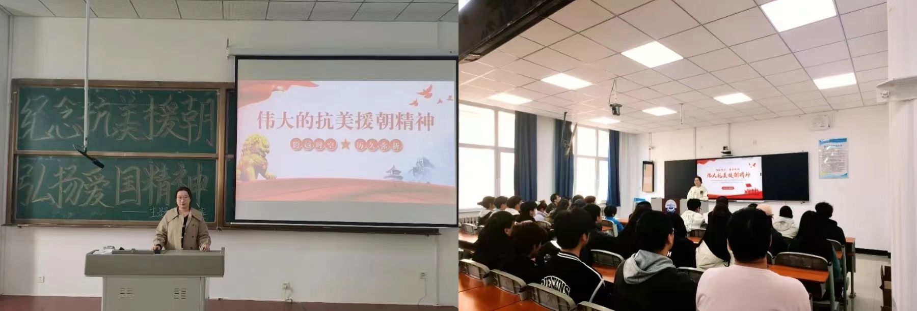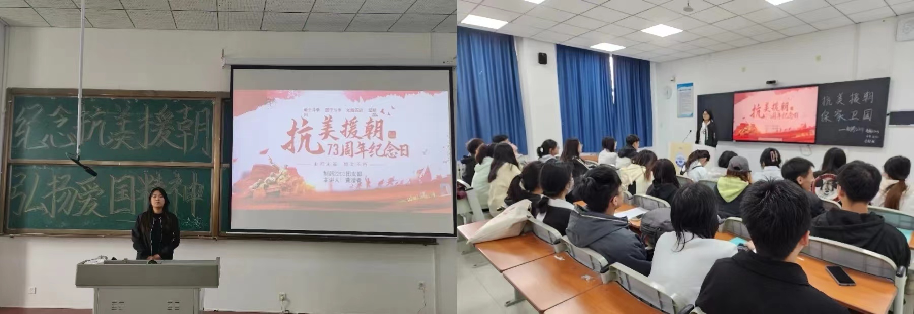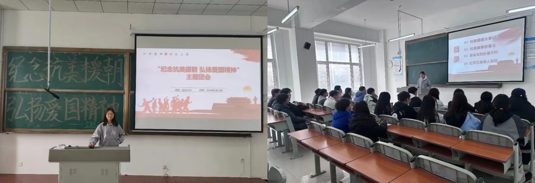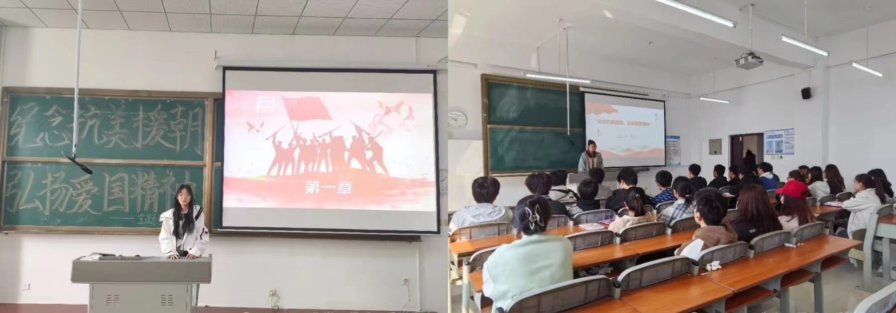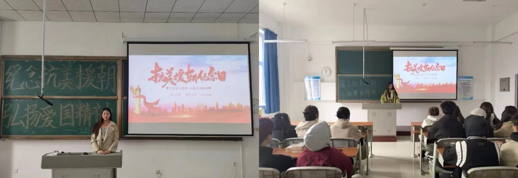 活动中,各团支部的代表人以播放PPT的方式进行了精彩的演讲,她们用真挚的感情述说着那段刻骨铭心的历史,抒发对抗美援朝的真实情感,各团支部的每位同学都积极参与,充分展现了同学们的热情。演讲中,她们激情昂扬,用铿锵的语言表达着对抗美援朝精神及其时代内涵的深刻理解,同时向同学们传达了对抗美援朝战士的赞美。她们精彩的演讲感染了在场的每一位同学,让同学们对英雄的敬意油然而生,对抗美援朝这场战争有了更深刻的认识。帮助同学们树立克服一切艰难险阻、战胜一切强大敌人的信心,让伟大的抗美援朝精神跨越时空、历久弥新。