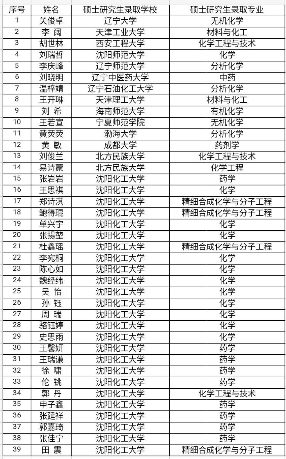 化学与化工系2024研究生录取名单在2024年全国硕士研究生招生考试中,我系2024届毕业生考研创历史佳绩,化学与化工系2024届毕业生195人,升学人数39人,升学率20%,比去年增加了5%。天道酬勤,唯有努力不会被辜负,向这些同学表示热烈祝贺!