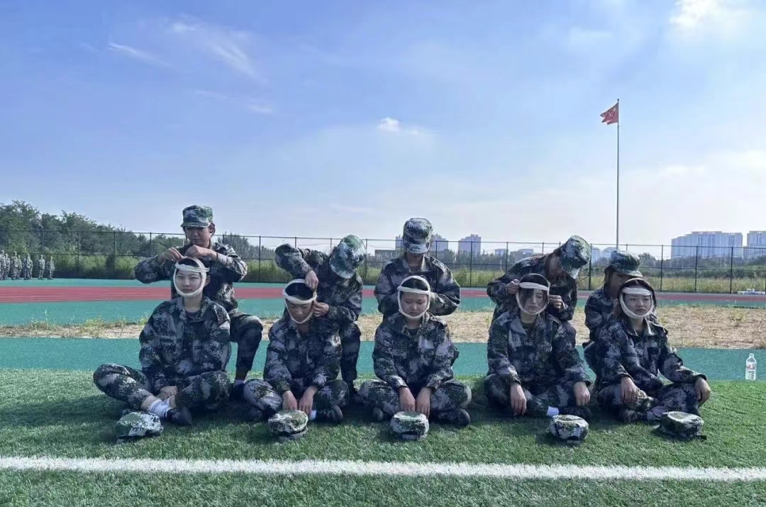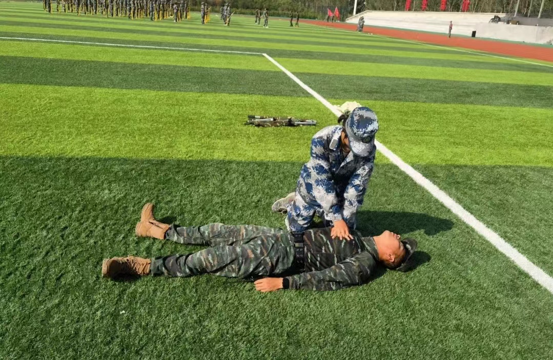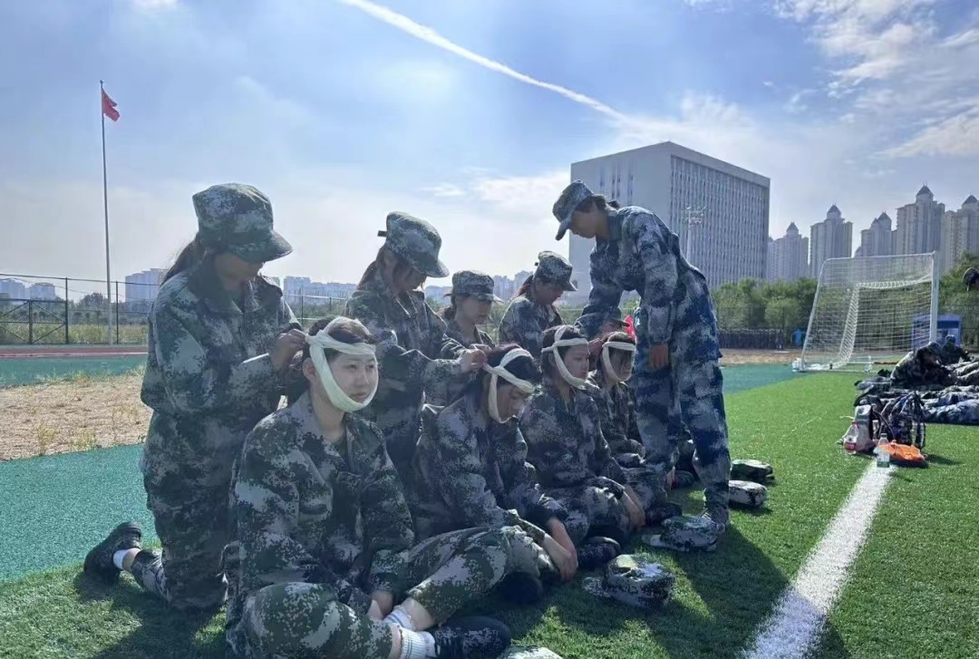 作为军训的一部分,战场医疗救护技能的演练同样不可或缺。教官们结合战场实际情况,为新生们讲解了伤员包扎等战场医疗救护常识。从手部包扎、胸部包扎,再到头部包扎的处理,每一个细节都体现了专业与严谨。