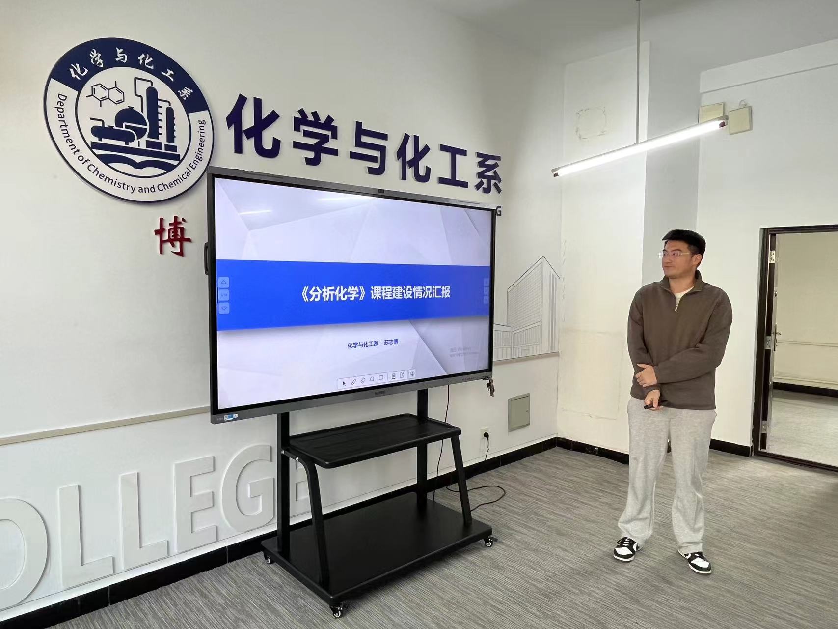接下来进行课程建设分享。首先苏志博老师进行分析化学课程建设情况汇报。苏老师从课程定位、教学模式、教学组织等方面进行分享,提出了《分析化学》作为基础性和理论性很强的一门课程,对于学生打好化学基础至关重要,对于课程的建设,今后课程组会继续不断学习新的教学理念,争取打造出更适合同学的学习方式。