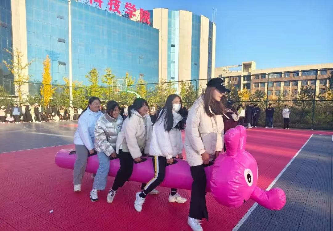 随着裁判员的一声哨响,毛毛虫趣味运动会正式拉开帷幕。参赛队员们骑在充气后的毛毛虫上,双手紧握固定把手,随着一声令下,大家齐心协力,步伐一致地向前冲刺。操场上, 呐喊声、加油声此起彼伏,同学们的脸上洋溢着欢笑与汗水,充分展现了青春的活力与激情。