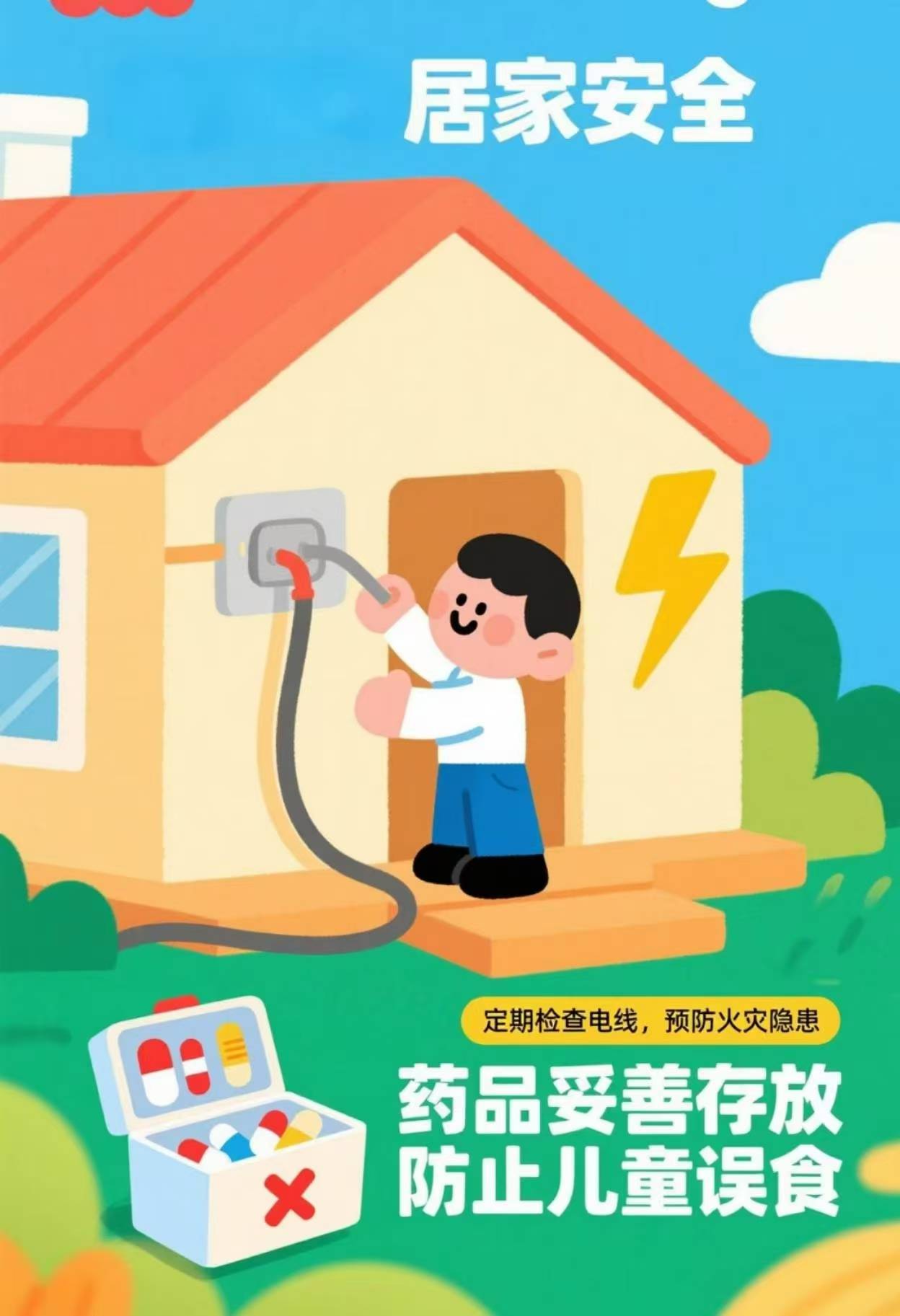 1. 用电用气:不用湿手触电器,及时关闭燃气阀门,定期检查电路、管道隐患。